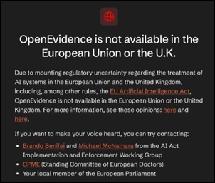 The hottest doctor reference source withdrew its medical evidence and decision support app from the UK and European markets. The news, reported in HIStalk on 28 April, is shocking–but not surprising. EU sources have predicted that this would be an outcome of the EU Artificial Intelligence Act. While the UK is not technically subject to EU regulation, the regulatory guidance to date has been along the EU Act’s lines; clearly a decision has been made not to enter the UK market accordingly.