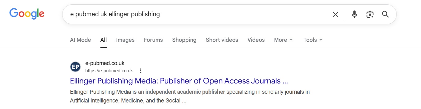 Gemini came up with this about Ellinger: “Ellinger Publishing Media: An independent academic publisher specializing in open-access journals, specifically focusing on artificial intelligence, medicine, social sciences, and interdisciplinary research.” Again, links in the AI summary to e-pubmed.co.uk do not work. My conclusion is that this is a total spoof/hack using a URL similar to the former UK E-PubMed and this Ellinger Publishing is a fraud. I don’t know how you picked it up but it’s no longer reachable.